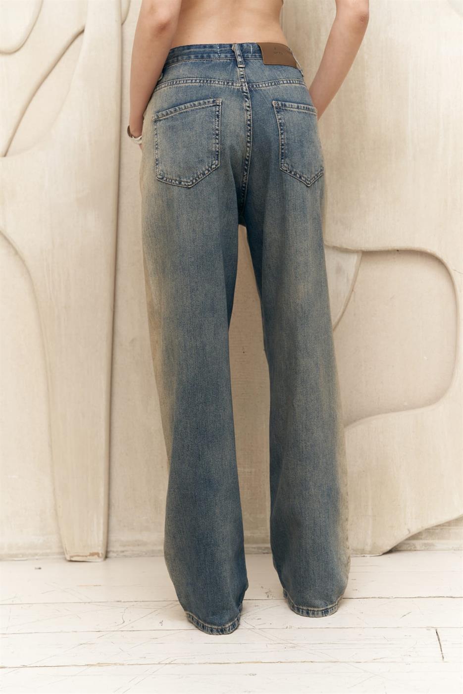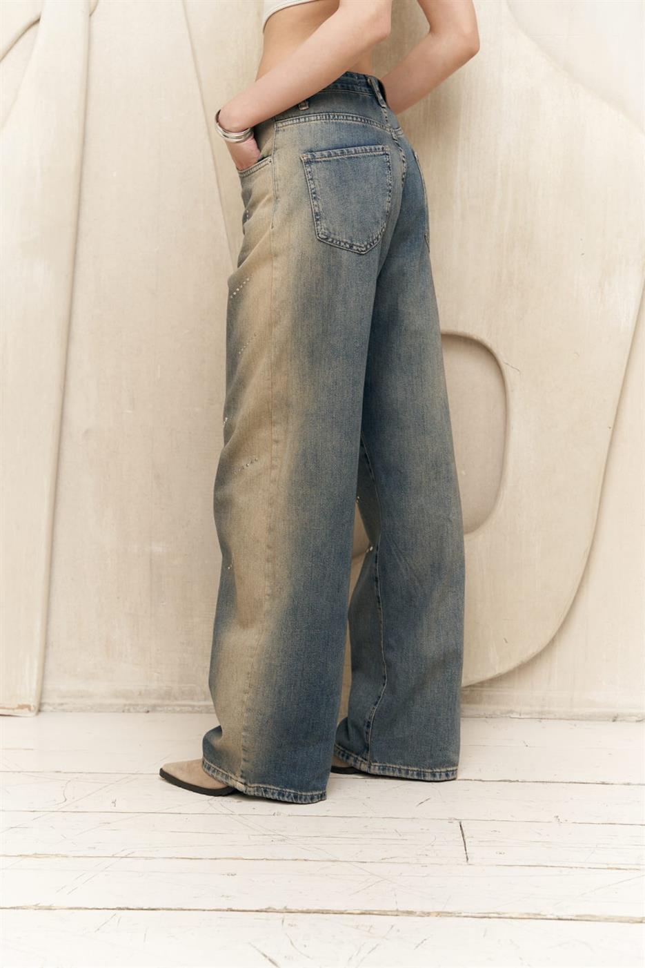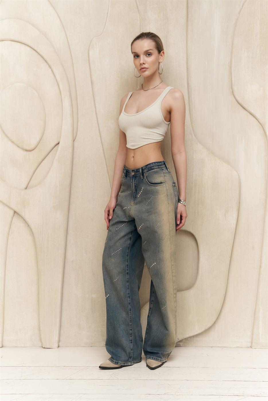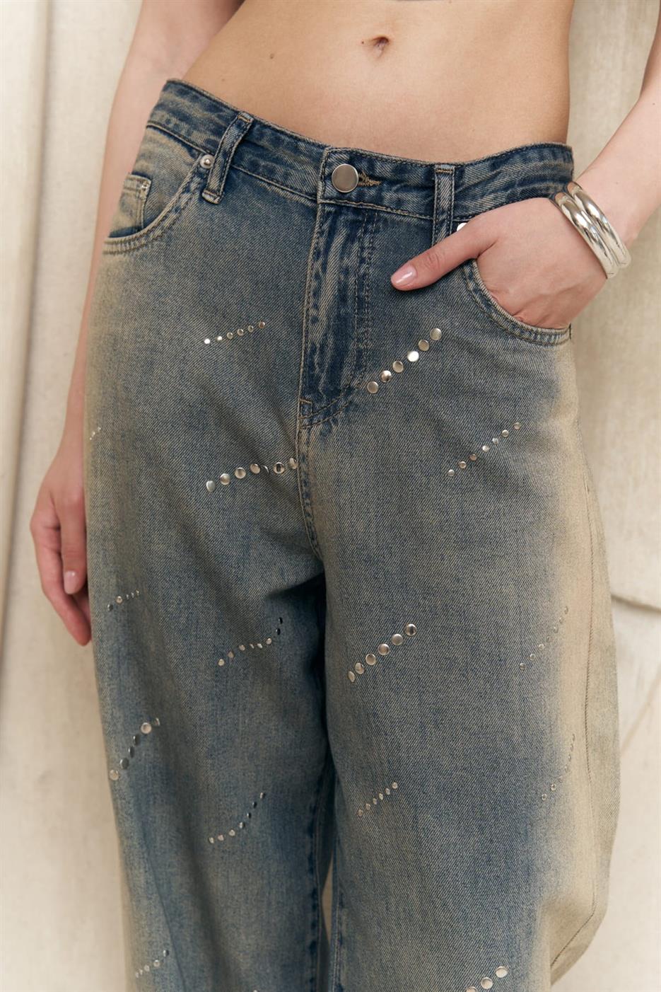 Washed tumbled jeans met nietjesdetail. Jeans met hoge taille en vijf zakken. Ritssluiting aan de voorkant en metalen knopen.