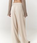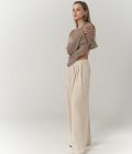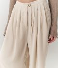 Plooibroek met normale taille en steekzakdetail. Extra lange wijde pijpen. Rits- en knoopsluiting aan de voorkant.