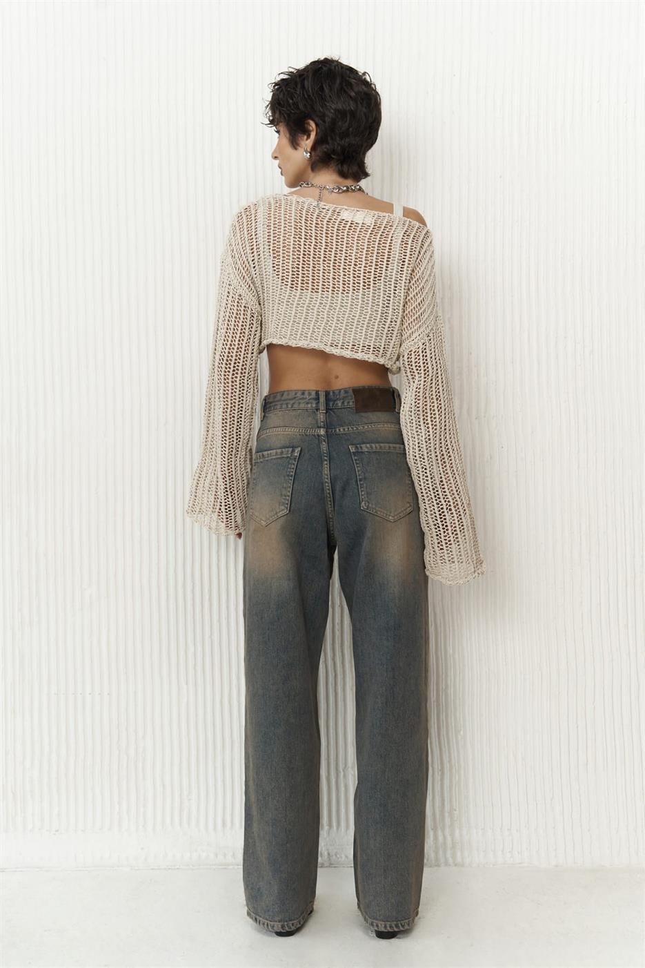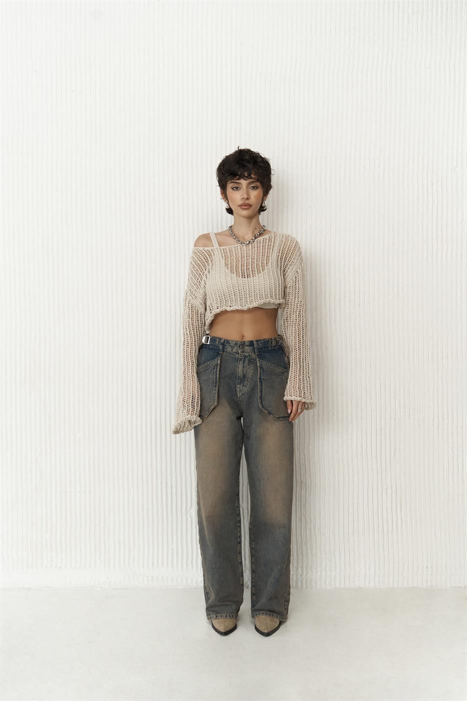 Ontwerp met brede zakken en riemdetail. Jeans met ritssluiting aan de voorkant en metalen knopen.