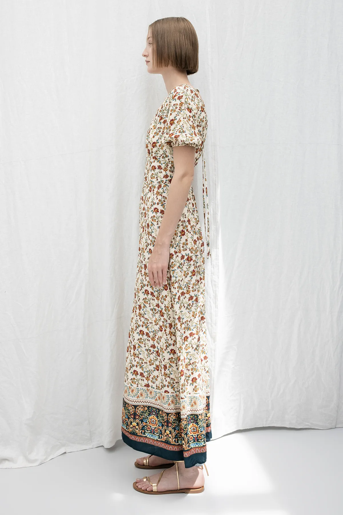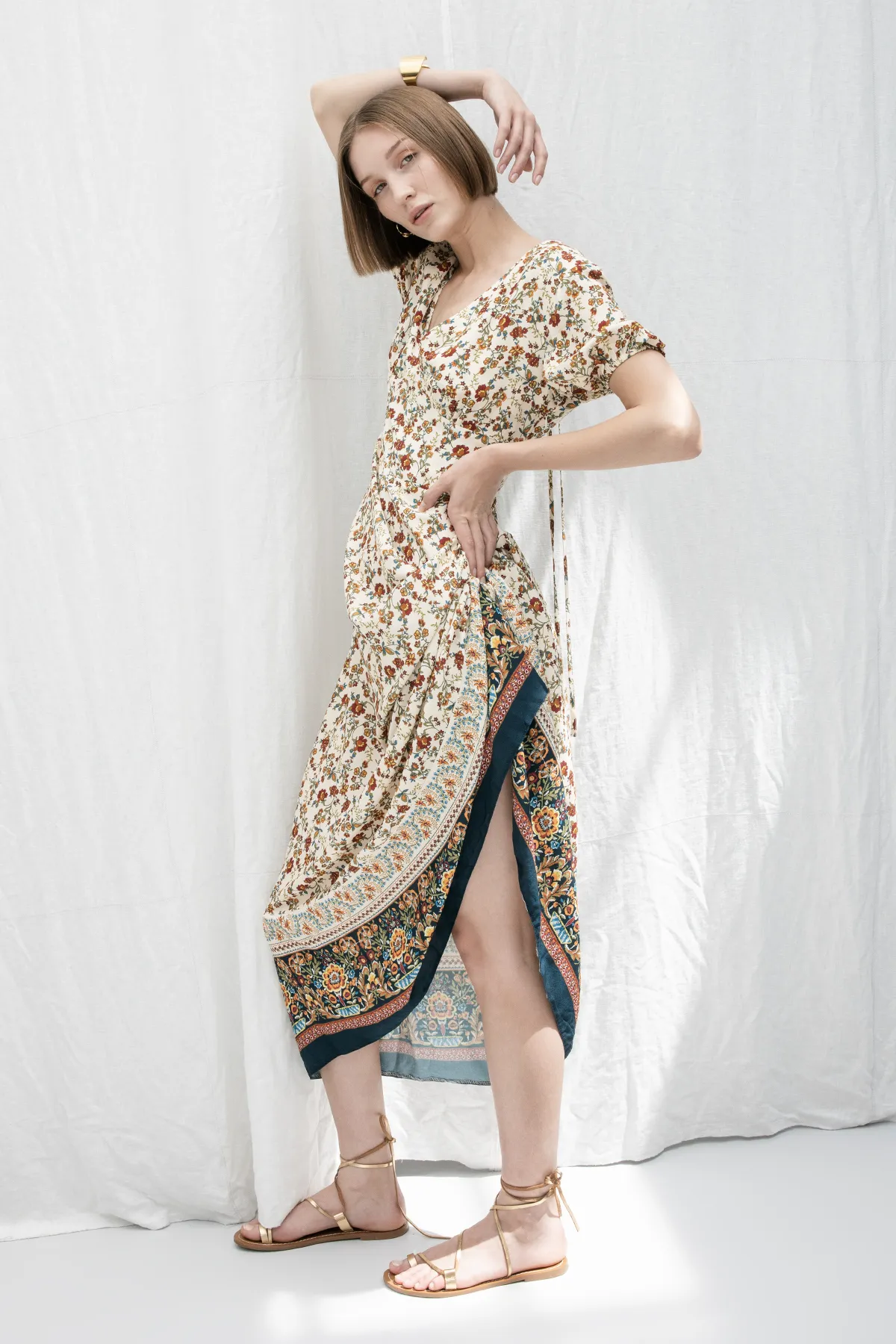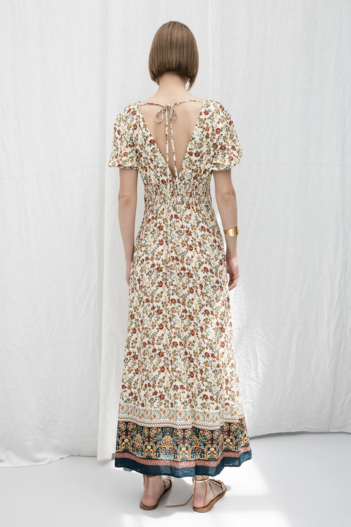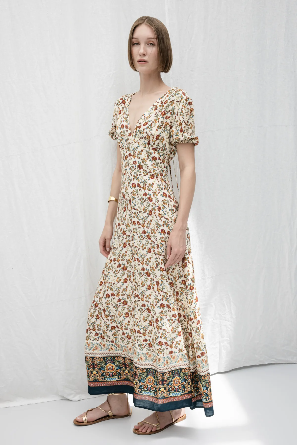 Crème Diepe V-Hals Midi Jurk